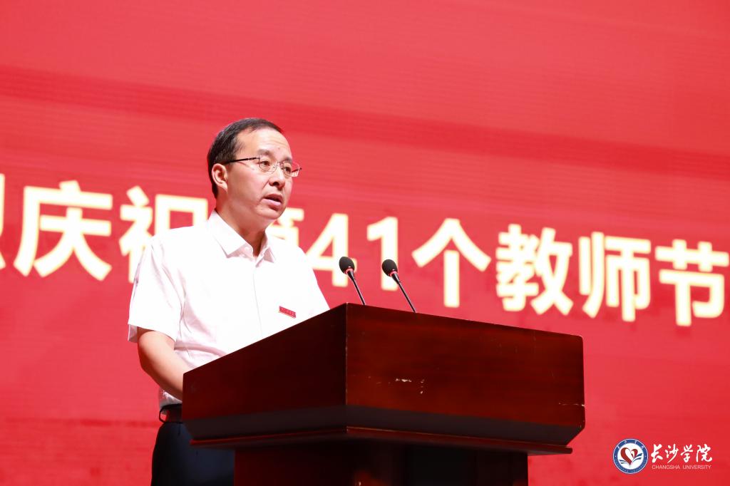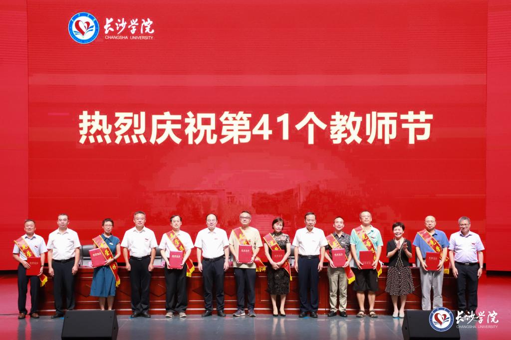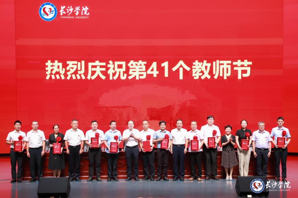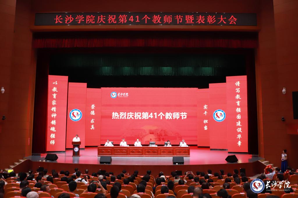 9月10日下午,我校在学生活动中心举行“‌以教育家精神铸魂强师,谱写教育强国建设华章”庆祝第41个教师节暨表彰大会。党委书记杨小云出席大会并讲话,校长陈赤平主持大会,全体校领导,全体科级以上干部,2025年度师德标兵、2024-2025学年获表彰奖励教师、荣休教师代表、新进教师,教研室、实验室主任以及在职教职工、学生代表等600余人齐聚一堂,共同庆祝第41个教师节的到来。