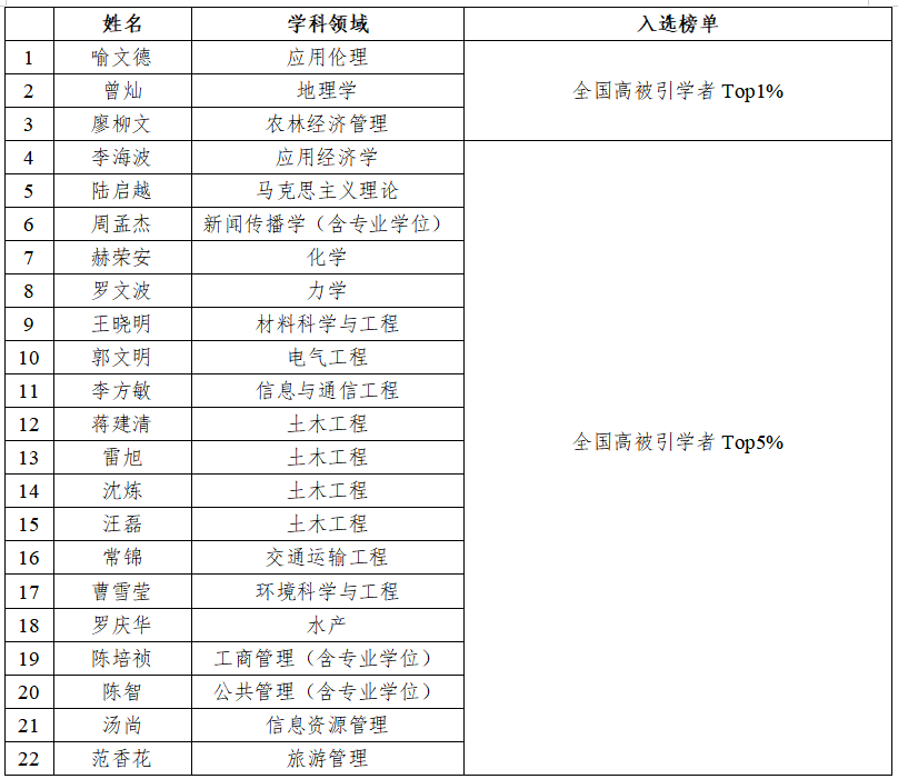 近日,中国科学文献计量评价研究中心正式发布“2025全国高被引学者”名单,我校共有22位教师成功入选。其中Top1%高被引学者3人、Top5%高被引学者19人,覆盖理、工、文、管等多个学科领域,入选人数与学科覆盖度均居省内同类高校前列。