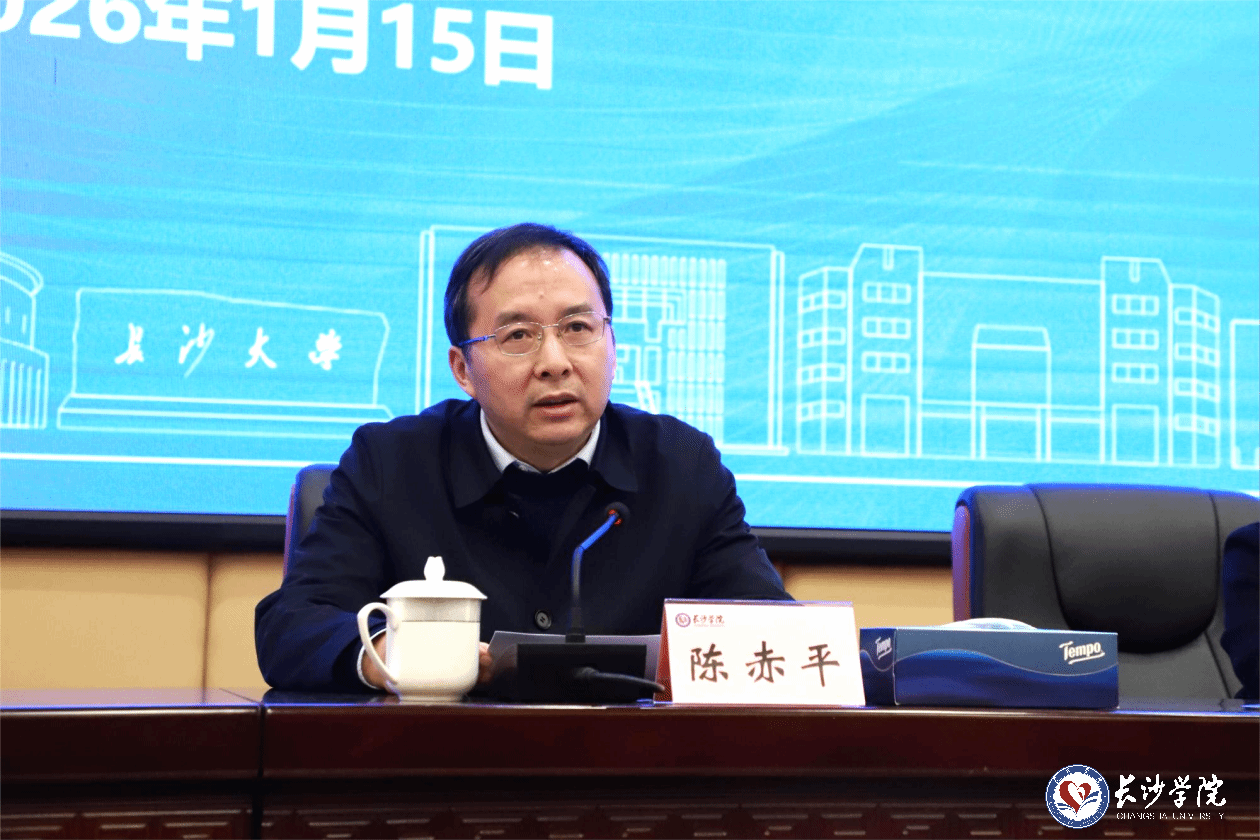 陈赤平在总结讲话中指出,此次会议是对学校过去一年发展成效的集中检阅,是对干部队伍精神状态和能力作风的全面审视,也是凝聚共识、谋划未来的重要契机。他充分肯定了过去一年学校在高质量完成本科教育教学审核评估、全面推进研究生教育等方面取得的显著成绩。他强调,2026年是“十五五”规划的开局之年,推动学校高质量发展使命光荣、责任重大。全校上下要思想统一、目标一致、行动划一,继续保持团结奋进、真抓实干的状态和冲劲,在人才队伍建设、学科专业调整优化、硕士学位点建设工作等方面认真部署推进,以更高站位、更宽视野、更实作风,奋力谱写长沙学院跨越式发展的新篇章。