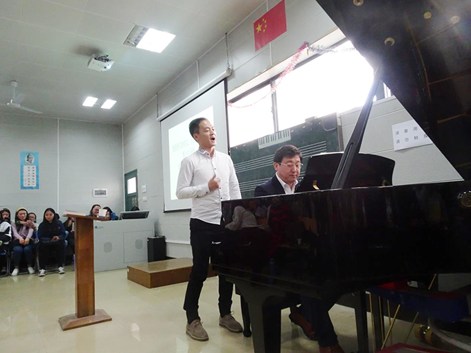 讲座中,徐敦广教授从发声、气息、歌唱情感三个方面阐述了歌唱技巧。他表示,唱歌的最高境界就是像说话一样,发音要自然、通畅;注意母音发音的准确和位置的统一等。随后,徐敦广教授进行了现场教学,就大家在声乐学习和演唱中存在的各种共性问题进行了现场指导。音乐系青年教师刘丹、贺辉、裴蓓和部分学生分别上台范唱,徐教授耐心地逐一指导,不时亲自示范演唱,在场音乐系师生均表示受益匪浅。