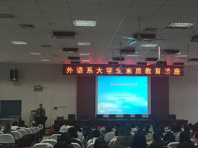 3月25日下午,北京外国语大学教授王文斌应外语系邀请,在致远楼学术报告厅为该系师生作了题为“论英汉语的时空性差异”的学术讲座。外语系主任雷志敏教授主持了讲座,外语系2013级学生及部分教师聆听了讲座。