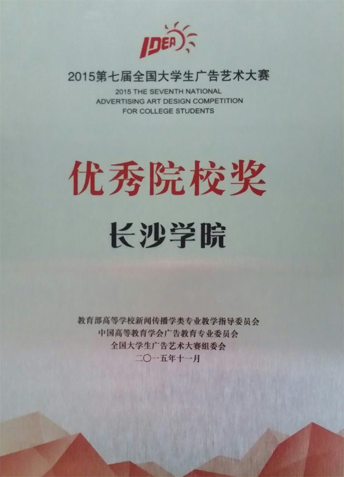 2015年11月21日,第七届全国大学生广告艺术大赛颁奖典礼在全国政协礼堂隆重举行,教育部相关领导、各分赛区负责人、获奖师生代表900余人齐聚北京出席颁奖典礼。我校学生在此次比赛中荣获一等奖3项,二等奖2项,三等奖3项;我校以全国总排名第二的成绩荣获"全国优秀院校组织奖"。这是我校学生自2012年以来第四次在此类比赛中获得好成绩。