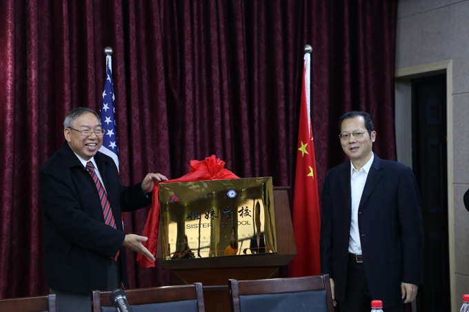纪委书记杨兴龙与陈剑明董事共同为姐妹校揭牌