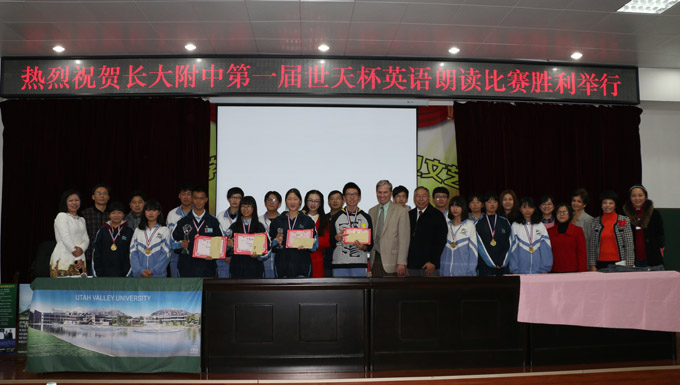 当天下午,陈剑明董事率国际学校专家团队就与附中合作开展了第一次活动,共同举办第一届"世天杯"英语朗诵比赛,此次大赛由世天国际教育集团赞助支持,附中初、高中共30位选手参赛,师生代表近200余人参加了此次活动。赛后,陈剑明博士和附中校领导共同为获奖学生颁奖。英语朗诵比赛的圆满结束为本次签约仪式划上了完美的句号。