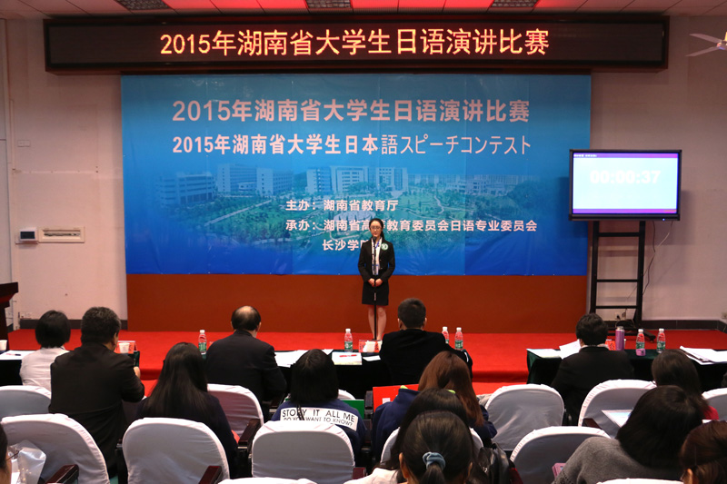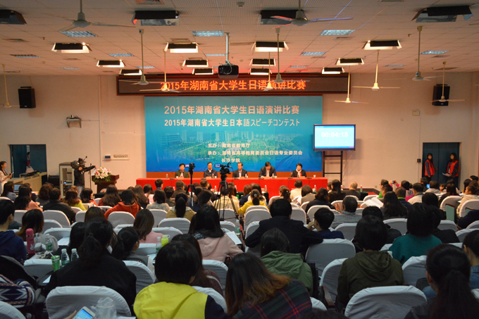 11月7日,由湖南省教育厅主办,长沙学院和湖南省高等教育学会日语专业委员会联袂承办的2015年湖南省普通高等学校大学生日语演讲比赛在我校致远楼学术报告厅隆重举行。湖南省教育厅副厅长葛建中,长沙学院党委书记韦成龙,长沙学院副院长屈林岩,湖南省教育厅高教处处长唐利斌,湖南省日语专业委员会会长、湖南大学外国语学院副院长张佩霞出席了开幕式。《日语学习与研究》主编、中国日语教学研究会副会长、中国商务日语教学研究会副主任、对外经济贸易大学教授李爱文,湖南省日语专业委员会副会长、中南大学教授陈月吾,教育部高等学校外语专业教学指导委员会日语分会副主任委员、洛阳外国语学院教授许宗华,上海海事大学副教授、博士谢新平,滋贺县厅经济交流驻在员桥本明郎,明照日语专修学校外籍教师儿玉直担任大赛评委。