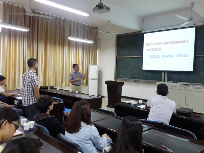 5月4日下午,应我校环境光催化应用技术省重点实验室邀请,中南大学教授杨华明来我校交流讲学,在理工楼A303作了《基于天然纳米尺度的功能材料设计及其性能调控》专题报告,并与生物与环境工程系应用化学、环境工程专业的教师及部分学生进行了学术交流,我校正院级督导员郭清泉出席并主持了讲座。