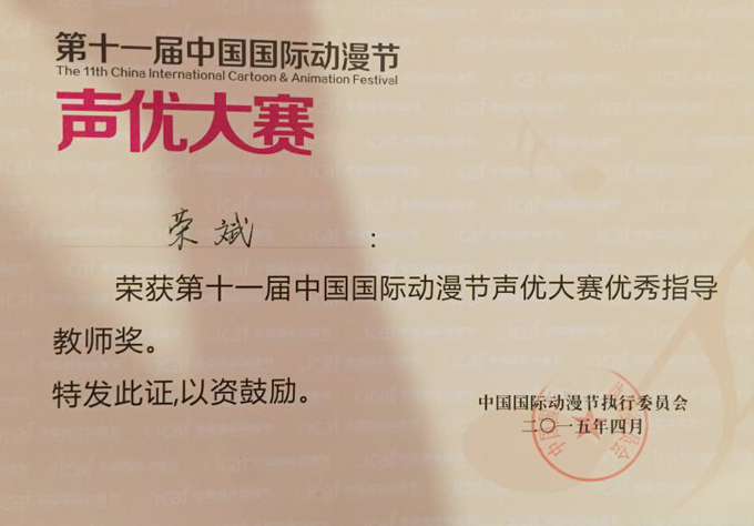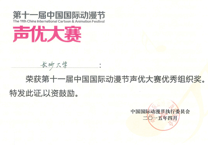 近日,第十一届中国国际动漫节声优大赛总决赛在杭州浙江传媒学院圆满落幕。我校首次参加此类比赛并获得不俗成绩。由中文与影视传播系副主任荣斌老师指导、史俊博(13航空班)和朱诗语(11播音2班)组成的"奇葩组"荣获大赛二等奖。我校中文与影视传播系选送的另外三支团队都顺利进入百强并获得优秀奖。荣斌老师获得最佳指导教师奖。我校获得优秀组织奖。