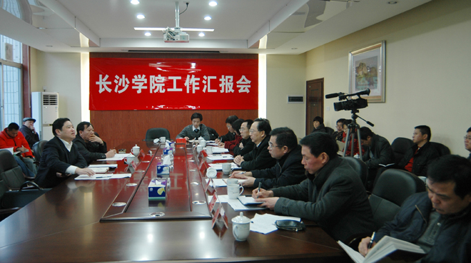 汇报会由党委书记黄中瑞主持。院长刘耘就我校工作基本情况、近年工作的主要成绩、发展过程中面临的挑战和存在的主要困难以及今后工作的基本思路进行了汇报,代表学校请求市委、市政府进一步加强对长沙学院的领导和支持力度、加大对学校高端人才队伍建设的扶持。党委书记黄中瑞对我校迎接2013年教育部组织的本科教学工作合格评估及与湖南大学合作共建"分子诊断与药物研发中心"等工作作了补充说明,对市委、市政府对长沙学院建设和发展所给予的支持表示感谢。
