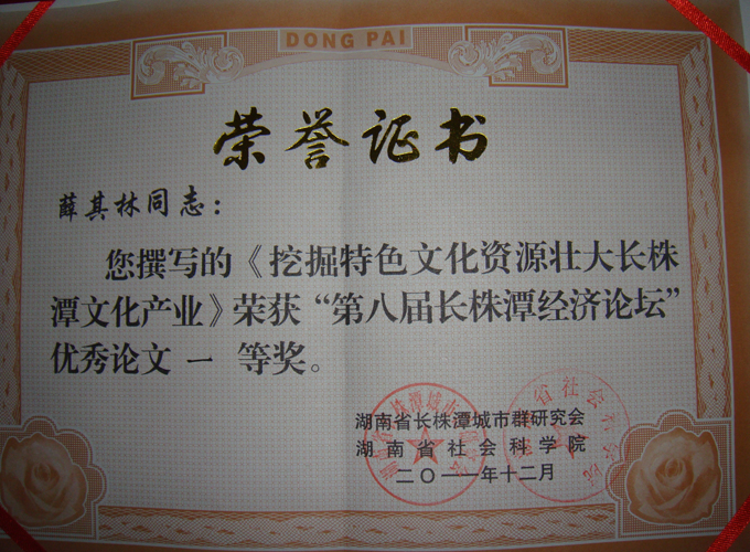 我校长沙文化研究所薛其林教授撰写的《挖掘特色文化资源 壮大长株潭文化产业》一文荣获湖南省长株潭城市群研究会、湖南省社会科学院联合举办的"第八届长株潭经济论坛"优秀论文一等奖,同批获一等奖论文共16篇,二等奖论文26篇。该文被收入"长株潭城市群蓝皮书"系列之《长株潭城市群发展报告(2011)--"两型社会"建设纵深推进探索》一书,该书由中共湖南省委书记、省人大常委会主任周强作序。同期收录的有中共湖南省委常委、长株潭试验区工委书记陈肇雄撰写的总报告《长株潭"两型社会"建设阶段回顾与纵深推进》,湖南长株潭城市群研究会会长张萍撰写的《"两型社会"建设新阶段与转变发展方式攻坚研究》等论文39篇。