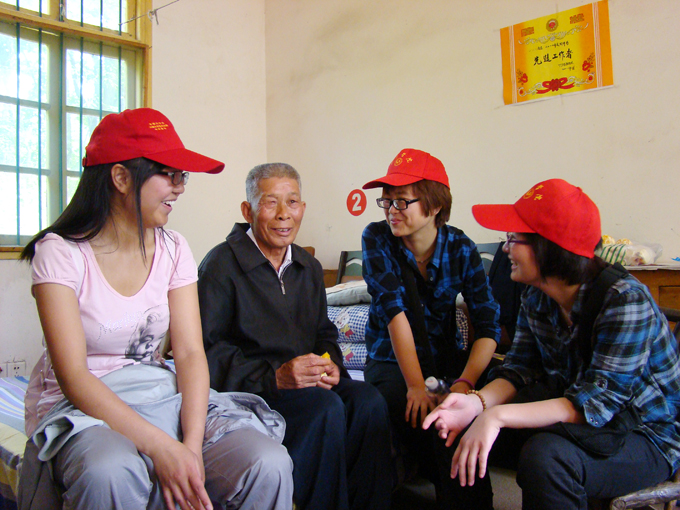 挂牌仪式后,师生们与敬老院的老人开展了互动。有的同学和老人谈心,有的则为老人打扫卫生,大家干得不亦乐乎。同学们还为老人献上了精彩的表演,唱红歌,跳啦啦舞。老人们被同学们青春的活力感染了,他们也开始拉二胡、吹口风琴、唱歌,与同学们一起演绎《刘海砍樵》。欢快愉悦的气氛萦绕着整个敬老院。分别的时候,老人们依依不舍地送别师生,不断表达着真挚的感谢。