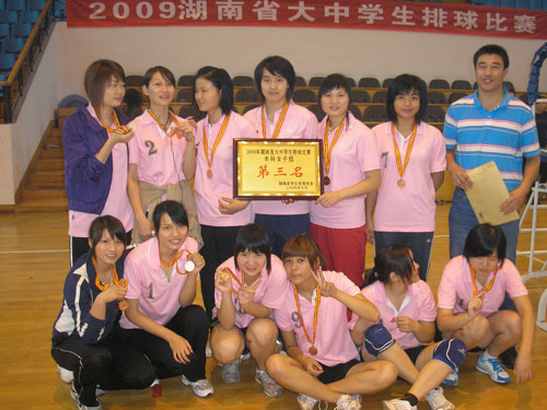 2009年10月27日至11月4日,我校女子排球队在领队曾一兵,教练员周英华、杨芳良的带领下,参加由湖南省教育厅主办,常德市教育局承办的2009年湖南省大中学生排球赛。本次比赛有来自省内10多所高校的15支男、女队伍参赛。我校运动员团结奋进,努力拼搏,赛出水平,赛出风格,荣获第三名。我校队员汤清、梁慧玲两位同学被授予"优秀运动员"光荣称号。