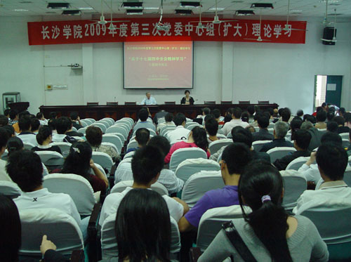 10月30日下午,科技楼学术报告厅内气氛热烈。为了更好地理解十七届四中全会精神,由校党委宣传部组织的长沙学院2009年度第三次党委中心组(扩大)理论学习暨十七届四中全会专题辅导报告会在此隆重举行。省委宣传部巡视员、省社科联主席、我校兼职教授郑佳明为我校师生解读了十七届四中全会的精神。校领导李咏芳、李云龙、钟惠英、宋达、郭清泉以及党委中心组成员、全体中层干部、各支部书记、思想理论课教师和各系辅导员、团学干部参加了报告会。会议由党委书记李咏芳主持。