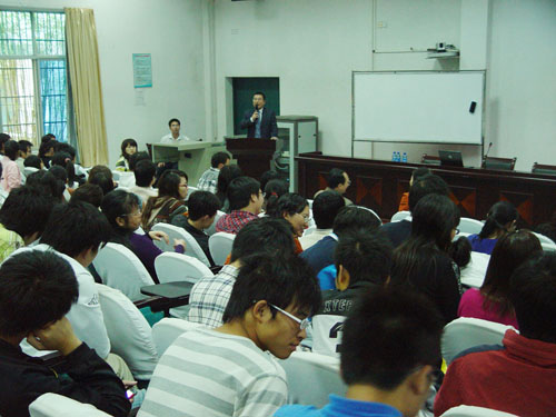 讲座首次采用两人合作的方式。李云龙给师生介绍了新校训的诞生过程和学习践行新校训的"十二字心法";陈蒲清从文化的角度阐释了新校训的意义。