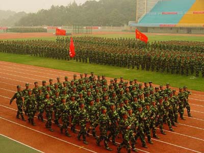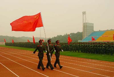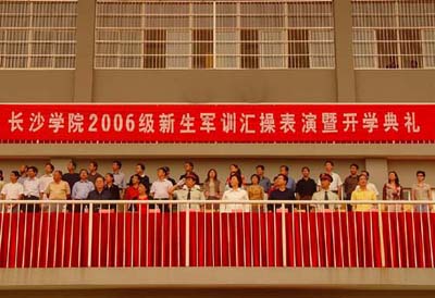9月29日下午,在我校新体育场隆重举行了2006级新生军训汇报演出暨开学典礼。李咏芳、李云龙、钟惠英、邓球柏、屈林岩等校领导和国防科技大学指挥军官基础教育学院副院长王立章大校、二大队副大队长钟志明上校出席了此次典礼。各部门负责人和各系辅导员、各班班主任和班导列席观看了汇报演出。副院长钟惠英主持典礼。