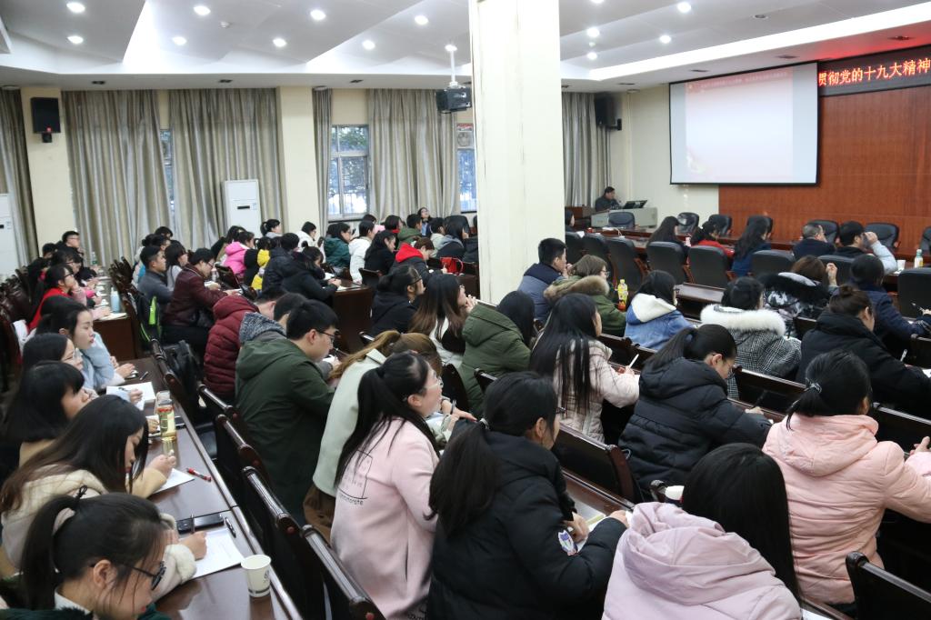 1月11日下午,党委书记韦成龙在我校图书馆一楼会议室为生物与环境工程学院、法学院、经济与管理学院、音乐学院的师生作了一场题为《认真学习贯彻党的十九大精神,发挥共产党员的先锋模范作用》的辅导报告。四个学院全体教师党员和学生党员聆听了报告,报告由法学院党总支书记张志刚主持。