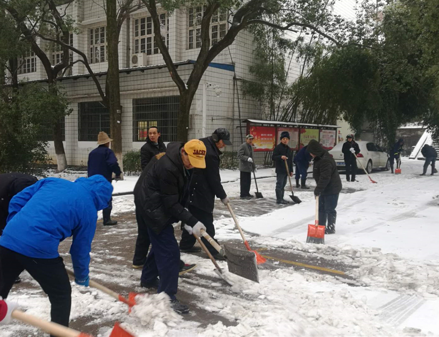 1月27日,受强冷空气影响,长沙的气温低至零下2度,冰冷的白雪覆盖了整个校园,道路完全被寒冰覆盖。在雨雪冰冻天气来临时,副校长周明侠立即组织保卫、学工、后勤等部门同志投入到抗冰抢险第一线。