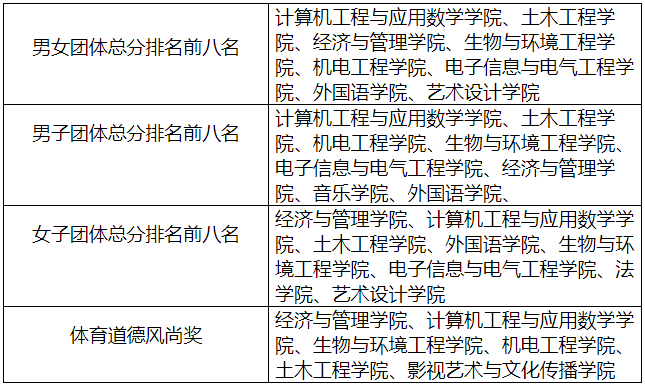 本次运动会历时两天,共设34项竞赛项目。其中,男子、女子项目各12项,集体项目7项。除此以外,今年还增设了体育摄影和桥牌比赛2个项目。我校11个二级学院代表队共计1095名运动员参加了比赛。经过激烈的角逐,计算机工程与应用数学学院代表队以365.5分的高分夺得男女团体总分第一名;经济与管理学院以117分获得女子团体总分第一;计算机工程与应用数学学院男运动员们以122.5分拿下了男子团体总分第一。生物与环境工程学院、土木工程学院等6个学院荣获体育道德风尚奖。
