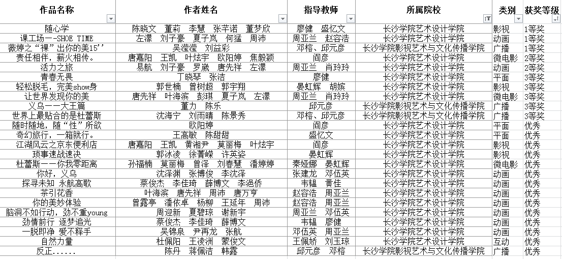 我校今年在此项赛事中共获等级奖10项:其中一等奖3项、二等奖2项、三等奖5项,优秀奖14项。同时,长沙学院以全国总排名第十三的成绩第六次获“优秀院校”称号。艺术设计学院青年教师周亚兰从19000多名指导老师中脱颖而出(全国只评40人),获第十一届“全国优秀指导教师”称号。全国企业唯一特别大奖“探歌创意锦鲤”奖也花落我校艺术设计学院。
