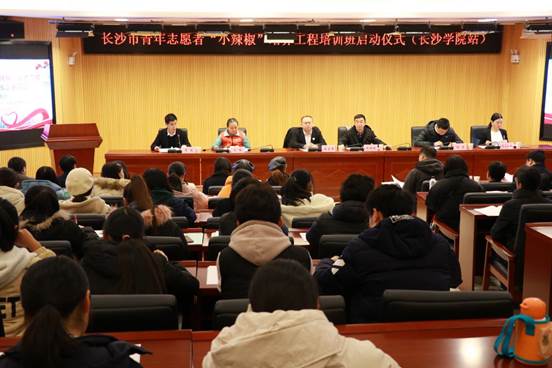 12月28日,长沙青年志愿者“小辣椒”培养工程启动仪式在我校新图书馆一楼会议室隆重举行。共青团长沙市委副书记赵雪峰、长沙学院党委委员、副校长周明侠、市青志联执行会长陈旭、市青年联2020年度执行会长李慰、湖南省礼仪文化交流协会会长李夫菲琳、共青团长沙市委统战联络部副部长徐力出席本次活动。启动仪式由市青年联2020年度执行会长李慰主持。长沙部分高校团委负责人及学生志愿者代表共计150余人参与了启动仪式。