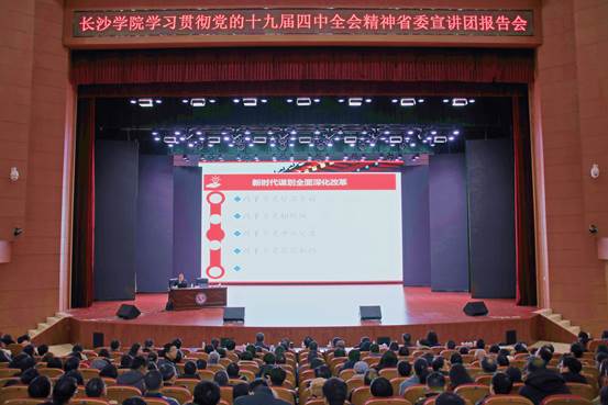 长沙学院党委班子成员、职能处室、学生辅导员、附属单位和部分师生代表近800人现场聆听了报告。很多师生感到,宣讲报告精彩、生动,接地气,感染力强。长沙学院党委班子表示,将以本次宣讲报告为契机,学深悟透党的十九届四中全会精神,全面提升学校治理体系和治理能力现代化水平,推动全会精神在师生中入脑入心,落地生根。