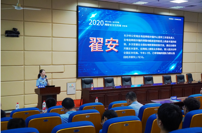 本次活动邀请了长沙市公安局反电信网络诈骗中心宣传工作室负责人翟安和梆梆安全公司湖南区域负责人彭帅进行了网络安全知识讲座,他们分别宣讲了电信网络诈骗防范和手机APP信息安全防护的相关知识。活动还组织在场学生开展了网络安全普法知识竞赛,有60名同学分别获得竞赛一、二、三等奖。