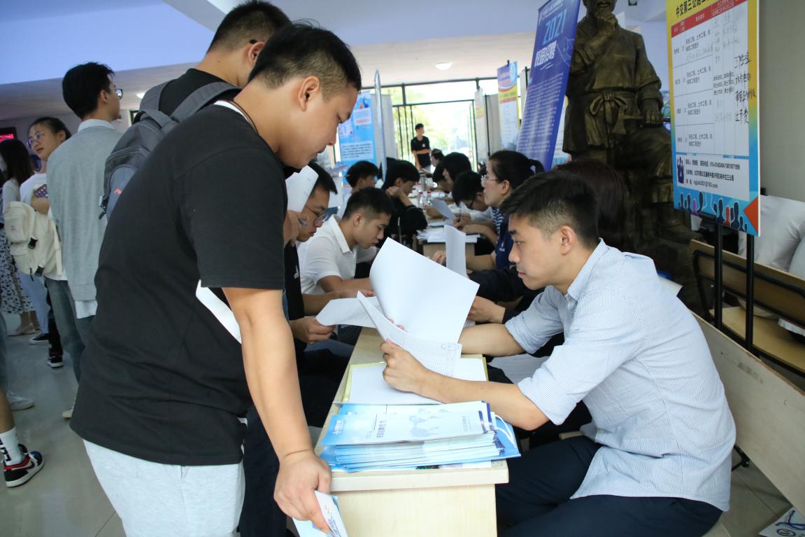 “水电八局是正式国企编制。”“对呀,没有试用期,入职就是正式员工。听说之前学生会主席也在这家单位。”9月15日,一场别开生面的招聘会在理工楼A区大厅举行,现场的同学们议论纷纷,应聘热情高涨。当天,土木工程学院在此举办2021届毕业生秋季双选会。300余名土木工程学院2021届毕业生及部分其他学院毕业生在26个企业展位前投递简历。