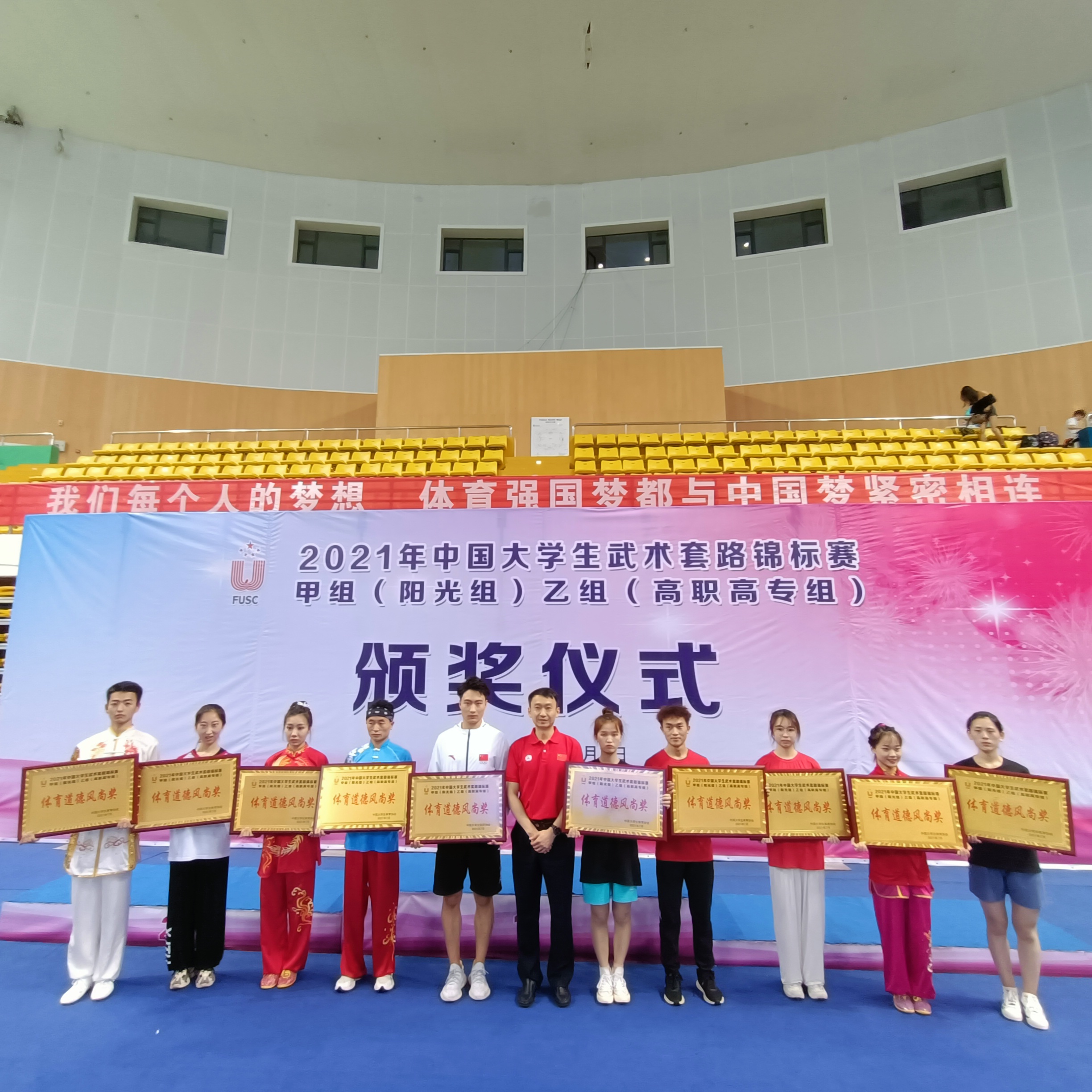 2021年中国大学生武术比赛于7月3日至8日在河北省唐山九江体育中心隆重举行。体育学院党总支副书记段岩任领队,与教练刘毅军、熊玮老师一起,带领我校代表队取得了4金5银4铜的优异成绩,并获赛事组委会授予“体育道德风尚奖”。刘毅军老师被评为优秀教练,宋林志被评为优秀运动员。