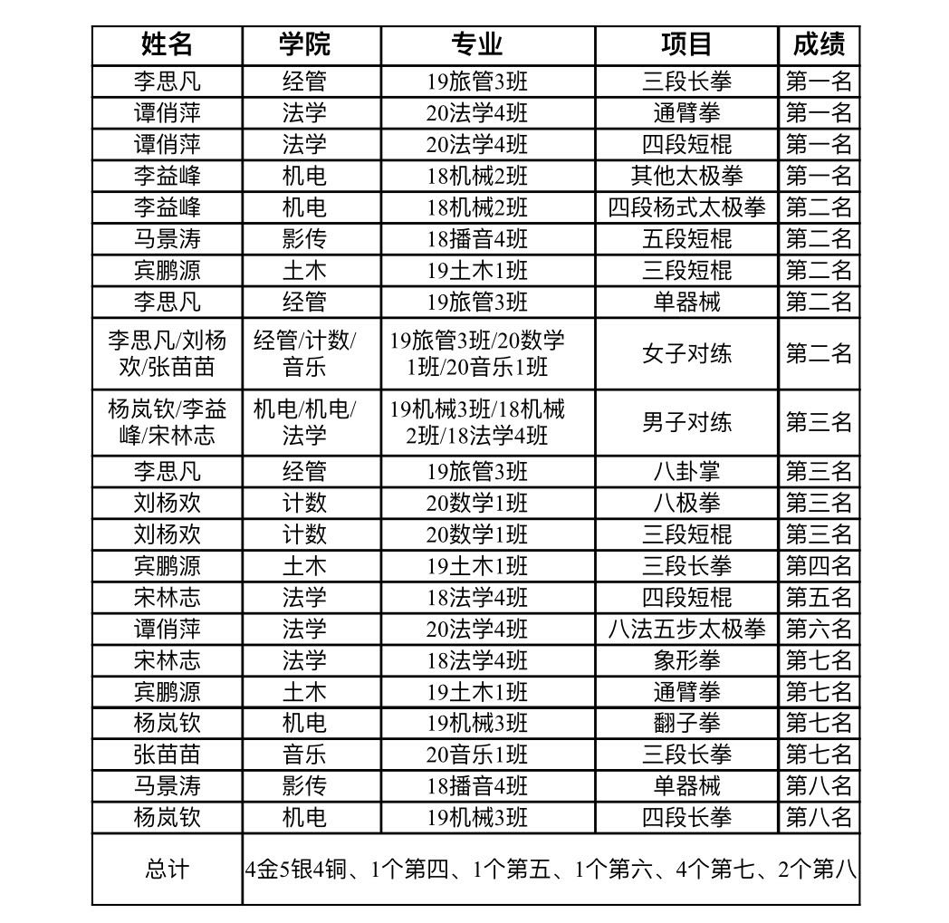 在比赛中,长大学子秉承“力学笃行”的校训,充分发挥了自身水平,展现了“崇德、求真、实干、担当” 的长大精神、传承了中华传统武术的精神内核,为我校争得了荣誉。我校武术队将继续秉承艰苦奋斗,努力拼搏的精神,争取再创辉煌!