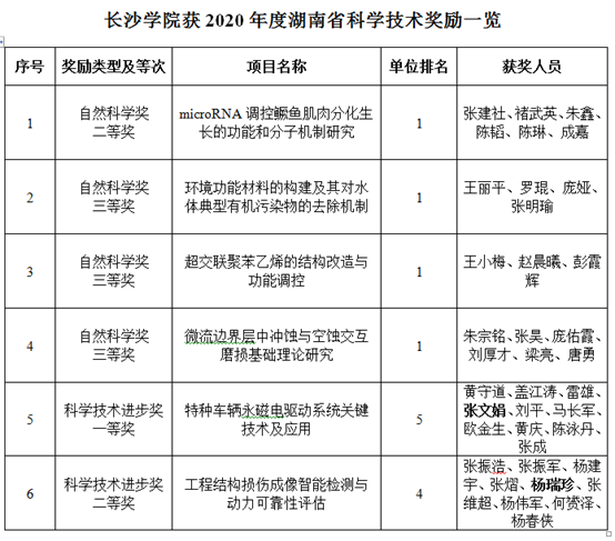 我校作为第一完成单位共有4个项目获得2020年度湖南省科学技术奖励,其中自然科学奖二等奖1项、三等奖3项。此外,我校还作为参与单位获得科技进步奖一等奖1项、二等奖1项。