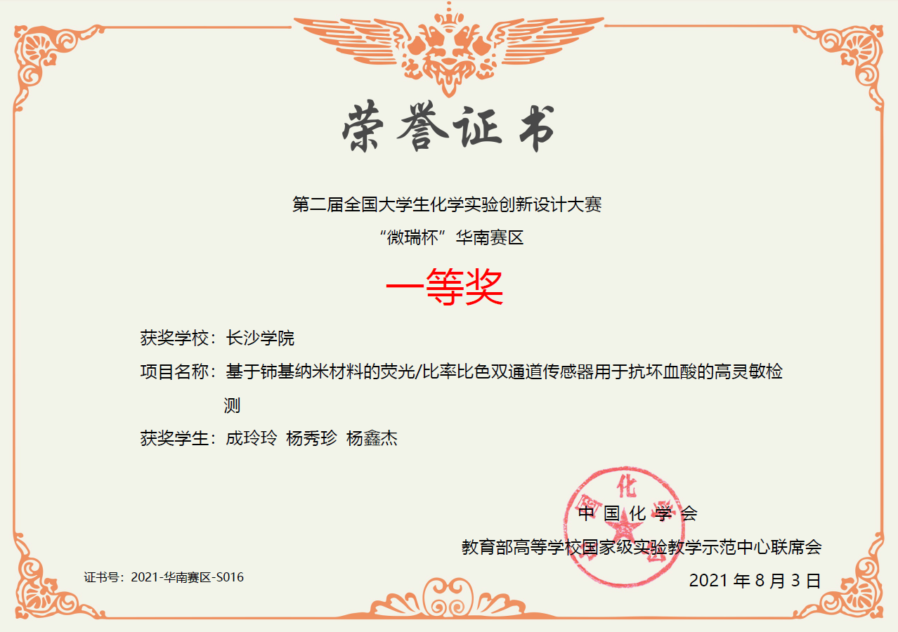 8月27日下午,“微瑞杯”第二届全国大学生化学实验创新设计竞赛全国总决赛在青岛科技大学落下帷幕。我校由生物与环境工程学院王海燕、罗金花老师指导,2018级应用化学专业成玲玲、杨秀珍、杨鑫杰三位同学报送的作品 “基于铈基纳米材料的荧光/比率比色双通道传感器用于抗坏血酸的高灵敏检测”荣获二等奖。