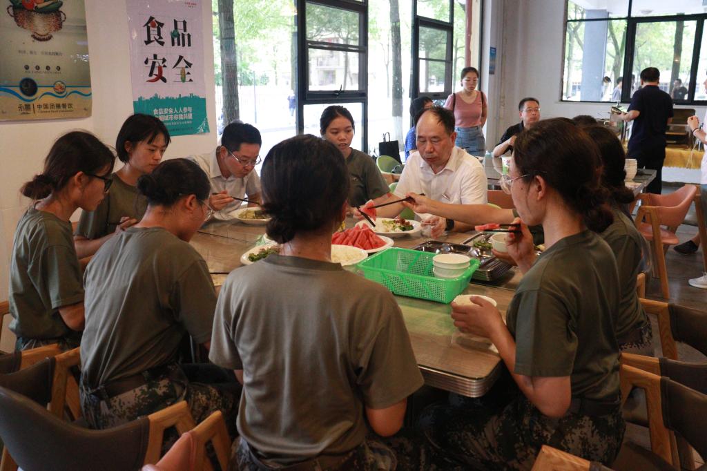 中午,党委副书记、校长黄立宏一行来到学生餐厅,与新生和军训教官们共进午餐。黄立宏对军训教官的辛勤付出表示感谢,勉励他们带好军训,展现出长沙学院军训的独有特色。同时,黄立宏还对新生提出,军训能够帮助大家进一步成长,一定要努力,学好大学入学的第一课。