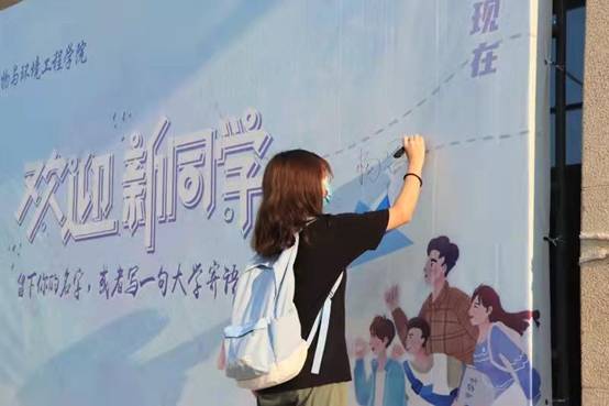 新生在学院欢迎展板上题名