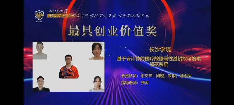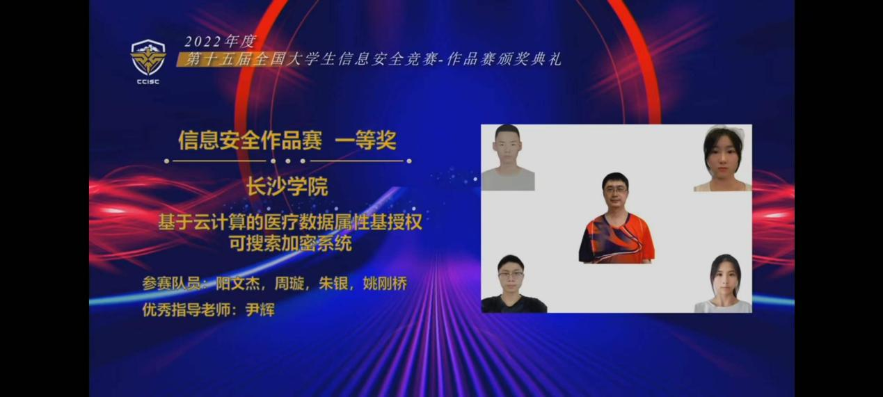 9月6日,第十五届全国大学生信息安全竞赛作品赛圆满落幕,长沙学院计算机科学与工程学院参赛团队凭借作品《基于云计算的医疗数据属性基授权可搜索加密系统》斩获全国一等奖和全国最具创业价值奖(全国仅10项),团队指导教师尹辉获得优秀指导教师奖。