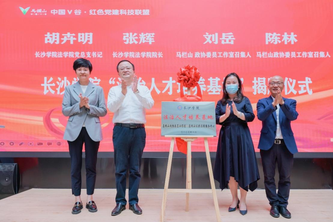 经过前期商讨,法学院与马栏山政协委员工作室达成战略合作协议,利用法学院优秀法律人才集中的优势,在马栏山政协委员工作室和马栏山公共法律服务中心挂牌成立“长沙学院法治人才培养基地”。胡卉明、张辉与政协委员刘岳、陈林共同为该基地揭牌