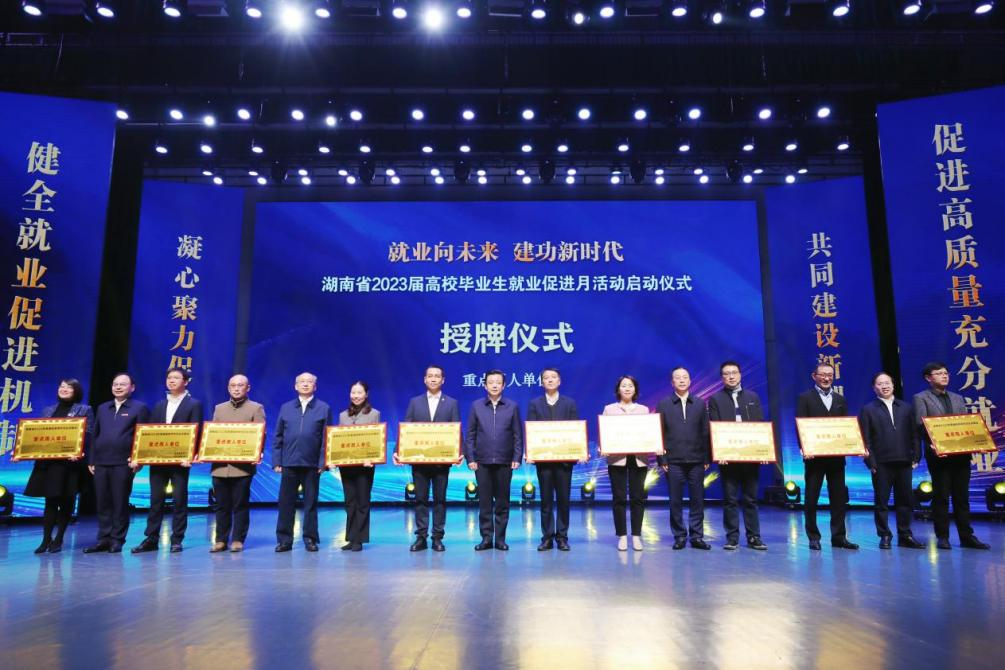 活动共评选出20家湖南省2022年普通高校毕业生就业重点用人单位。启动仪式现场,与会领导为中铁五局集团有限公司、中国水利水电第八工程局有限公司、中联重科股份有限公司、中兴通讯股份有限公司、蓝思科技股份有限公司、比亚迪股份有限公司、楚天科技股份有限公司、湖南三安半导体有限责任公司、益丰大药房连锁股份有限公司、湖南兴盛优选电子商务有限公司10家在长重点用人单位授牌。