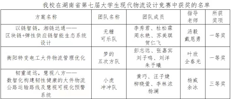 此次竞赛案例结合湖南省当前发展实际,围绕现代物流流通体系建设、国家物流枢纽网络建设等战略需求,着眼于行业热点、解决实际问题,突出服务地方经济发展的目的。我校物流团队提出的“以链智链,湘链达通—区块链+弹性供应链智能生态系统设计”“衡阳特变电工大件物流管理优化”“韧重道远,慧视八方—数智化构建韧性健康的大件物流公路运输路线及慧视可视化预警系统”得到专家高度肯定,充分展现了我校物流管理专业作为国家级一流本科专业的建设成效。