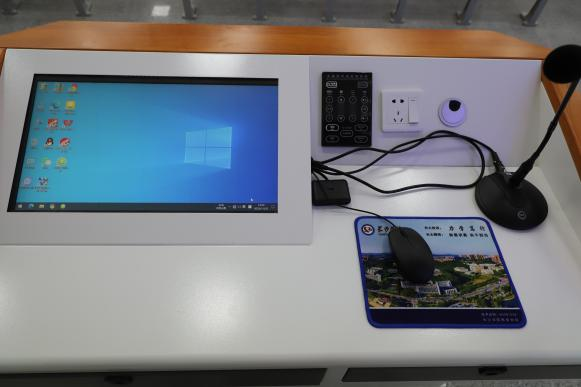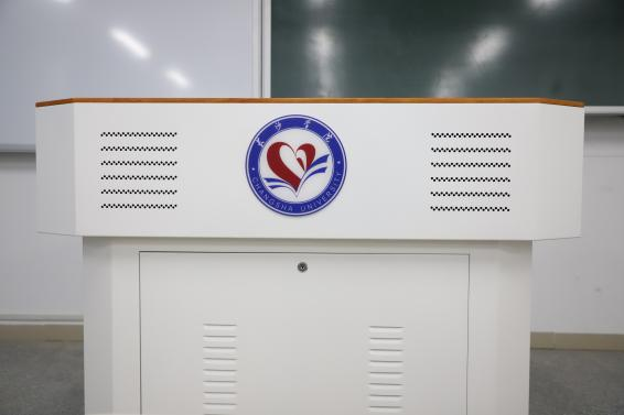讲桌采用钢木结合式材料,正面印有学校LOGO。桌面放置了HDMI高清信号接入线和USB扩展接口,满足移动设备连接,方便U盘插拔。嵌入式键盘盒、粉笔收纳盒、翻转置物挂钩、设备容纳器一应俱全。台面嵌入多媒体触屏控制面板,一键式开关多媒体设备。一系列人性化、智能化的设计,节省了教学时间,为广大教师的使用提供了便利。同时,定制鼠标垫也大受好评。