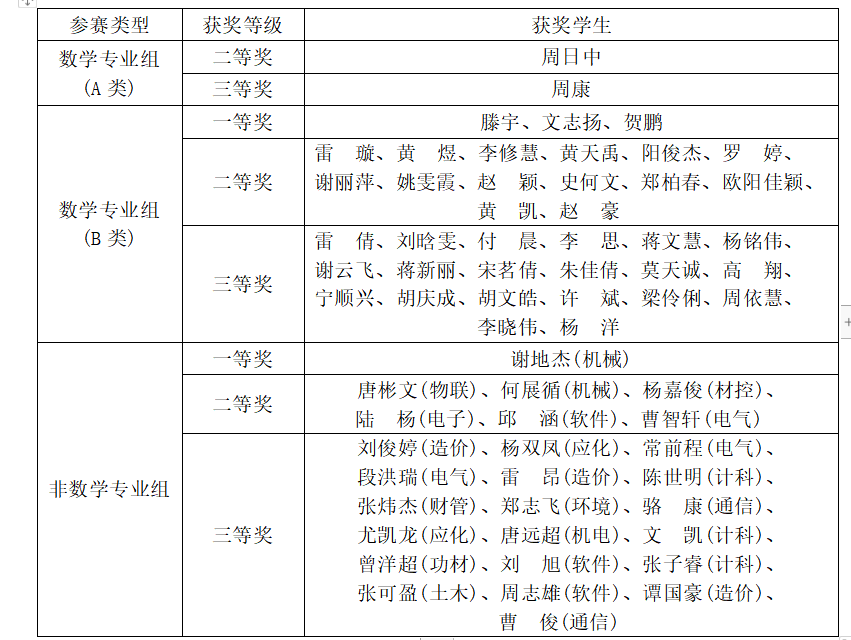 2022年第十四届全国大学生数学竞赛初赛暨湖南省大学生数学竞赛分别于2022年11月12日和12月11日(补赛)在各参赛高校就地举行,共有来自全省44所高校的3351名学生参加。我校选派120名同学参赛,共有65名同学获奖,其中获数学专业组A类二等奖1项,三等奖1项;B类一等奖3项,二等奖14项,三等奖20项;非数学专业组一等奖1项,二等奖6项,三等奖19项,获奖率和获奖总人数相较于前几届都有较大幅度提升。