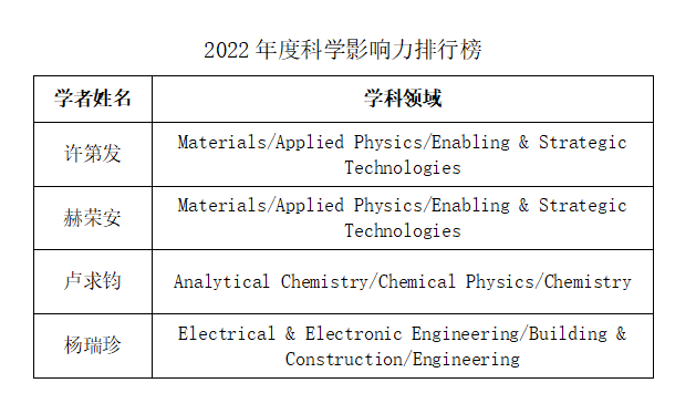 我校材料与环境工程学院许第发博士、赫荣安博士,生物与化学工程学院卢求钧博士和土木工程学院杨瑞珍博士共四名学者入选“2021年度科学影响力排行榜”。其中,许第发和杨瑞珍还入选2020年度科学影响力榜单,此次属连续入选。入选全球前2%顶尖科学家榜单,意味着我校学者在材料、化学、建筑结构等领域的研究具有较高的世界影响力,为该领域的发展作出了“长大”贡献。这不仅是对他们个人科研能力的充分肯定,而且是对我校学科建设和科研水平的充分肯定,对推动我校科技创新工作的发展,扩大我校的国际影响力有着积极作用。