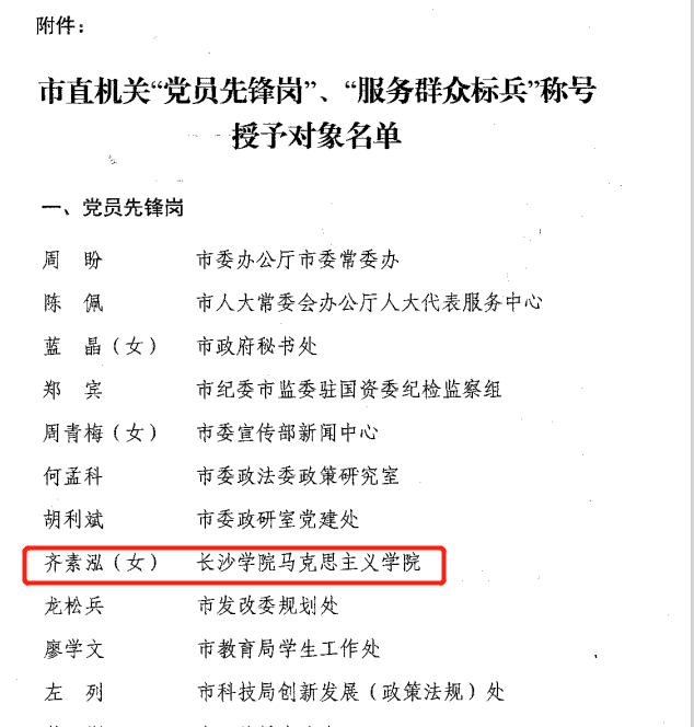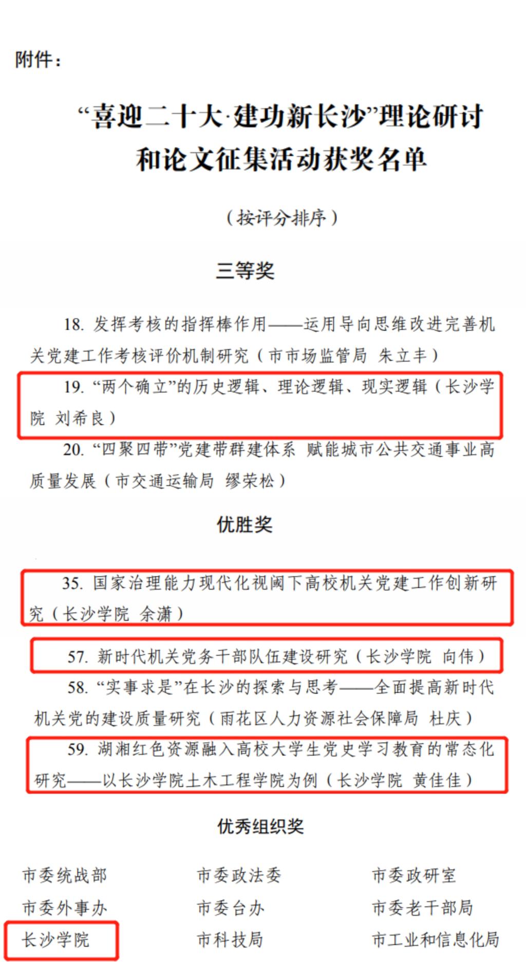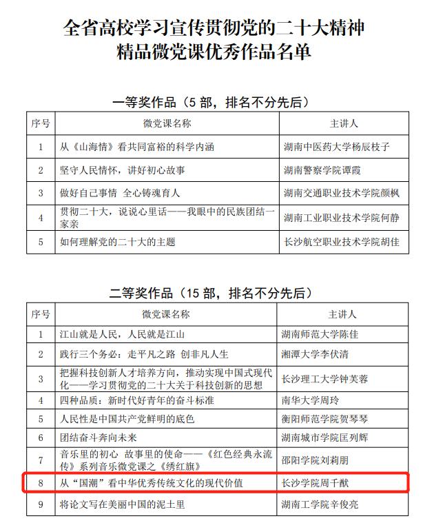 在省教育工委组织部开展的精品微党课评选活动中,马克思主义学院周千猷老师的微党课《从“国潮”看中华优秀传统文化的现代价值》获全省高校学习宣传贯彻党的二十大精神精品微党课二等奖。在市直机关工委开展的“喜迎二十大·建功新长沙”理论研讨和论文征集活动中,马克思主义学院刘希良老师的文章《“两个确立”的历史逻辑、理论逻辑、现实逻辑》获三等奖;马克思主义学院向伟老师的文章《新时代机关党务干部队伍建设研究》、土木工程学院余潇老师的文章《国家治理能力现代化视阈下高校机关党建工作创新研究》、土木工程学院黄佳佳老师的文章《湖湘红色资源融入高校大学生党史学习教育的常态化研究——以长沙学院土木工程学院为例》获优胜奖,我校获得优秀组织奖。马克思主义学院齐素泓老师获得长沙市直机关工委授予的“党员先锋岗”称号。