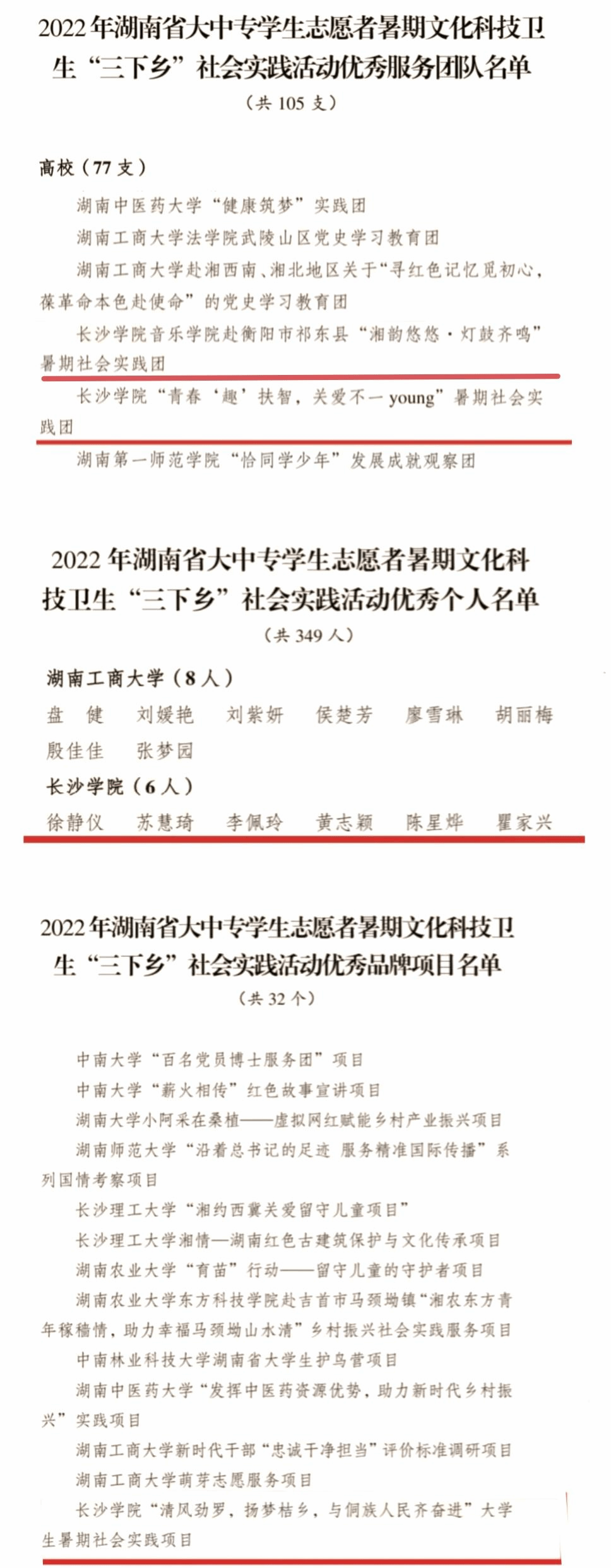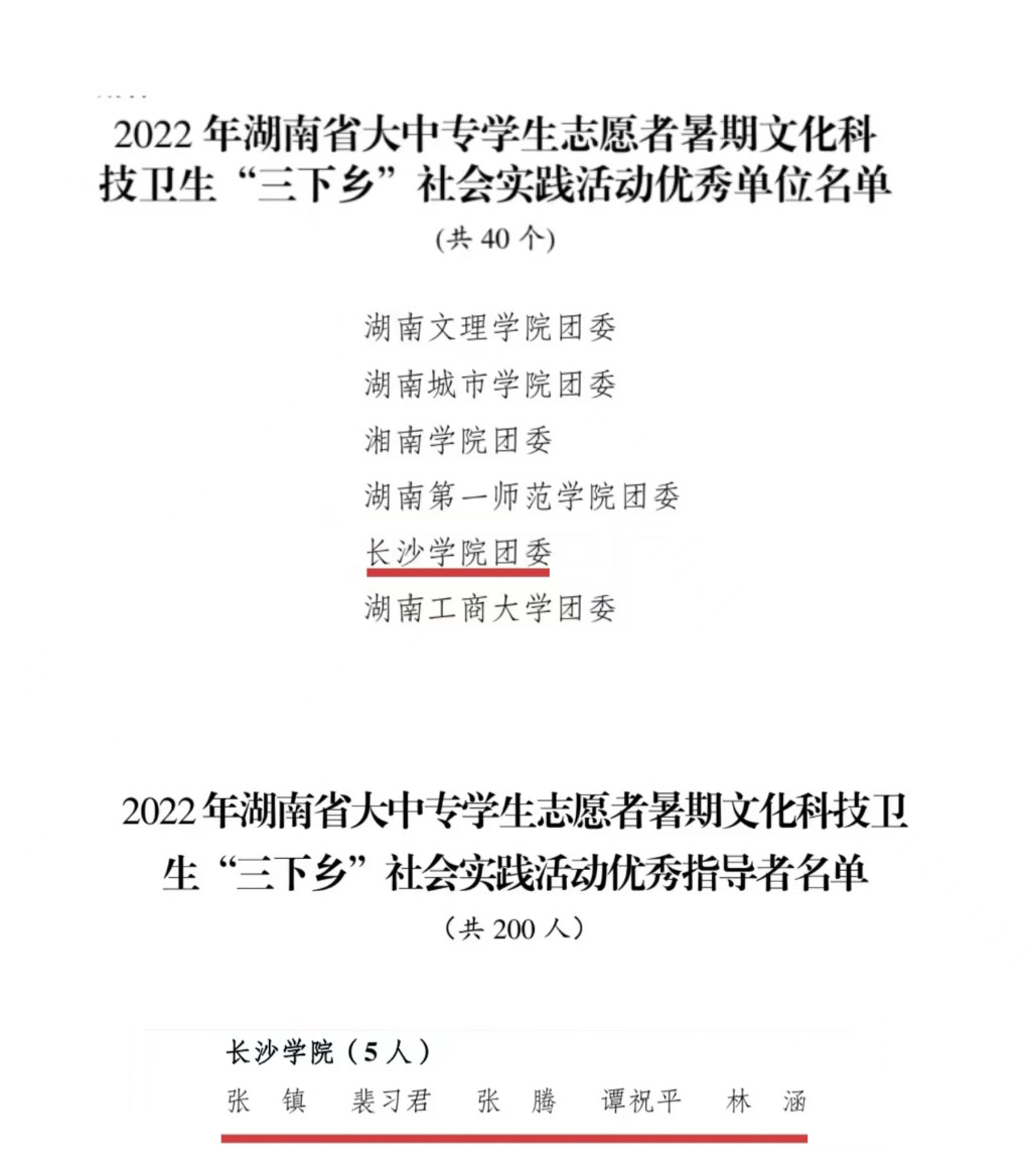 近日,中共湖南省委宣传部、共青团湖南省委、中共湖南省委教育工委、湖南省教育厅、湖南省文明办、湖南省志工办、湖南省学生联合会联合下发《关于2022年湖南省大中专学生志愿者暑期文化科技卫生“三下乡”社会实践活动优秀单位、优秀服务团队、优秀指导者、优秀个人、优秀品牌项目的通报》,对在2022年暑期文化科技卫生“三下乡”社会实践活动中表现优异的集体、个人和项目进行通报表彰。