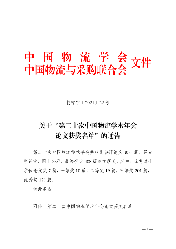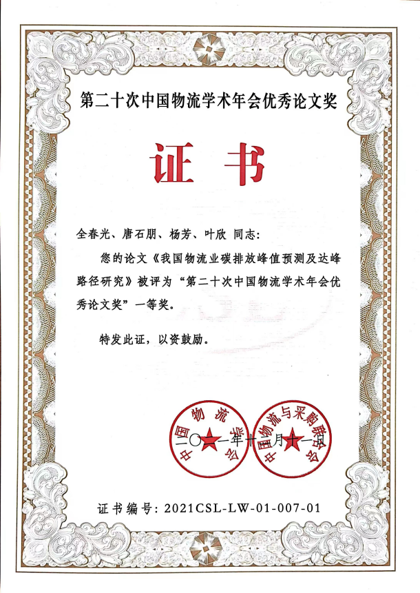 会上,中国物流与采购联合会副会长贺登才宣读了新一届产学研基地和特约研究员聘任名单,我校经济与管理学院物流管理专业建设负责人杨芳教授当选为第七届学会理事,物流教研室主任全春光副教授被聘为第七届第一批特约研究员,我校通过复核成为中国物流学会新一届“产学研基地”。全春光等老师撰写的论文《我国物流业发展碳放峰值预测及达峰路径研究》获“第二十次中国物流学会年会优秀论文奖”一等奖(全国范围内仅10篇)。
