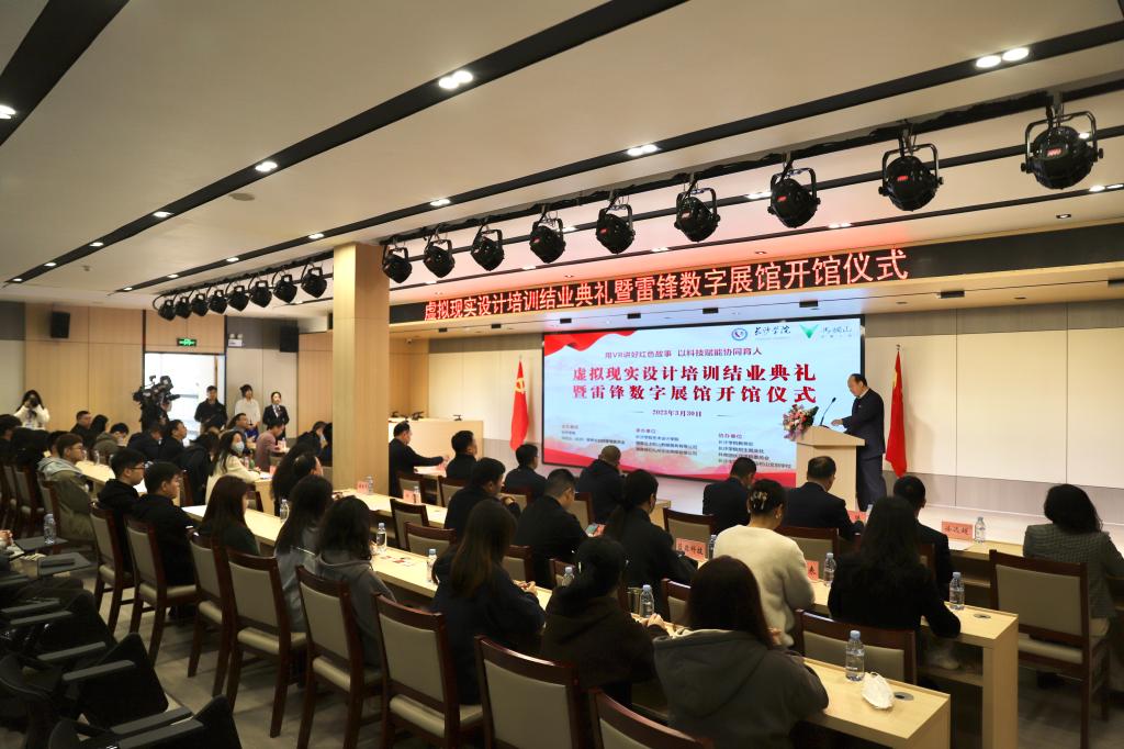 3月30日上午,我校联合马栏山(长沙)视频文创园管理委员会开展了虚拟现实设计培训结业典礼暨VR雷锋数字展馆开馆仪式。党委书记杨小云,党委副书记、校长黄立宏,党委副书记刘寒波,马栏山(长沙)视频文创园党工委书记邹犇淼,党工委委员、管委会副主任胡朝晖,长沙市实验小学马栏山文创学校校长陶源远,长沙马栏山投资开发建设有限公司等相关企业负责人及学校部分处室、文创园管委会有关负责同志等领导嘉宾出席活动。仪式由党委委员、副校长曾广胜主持。