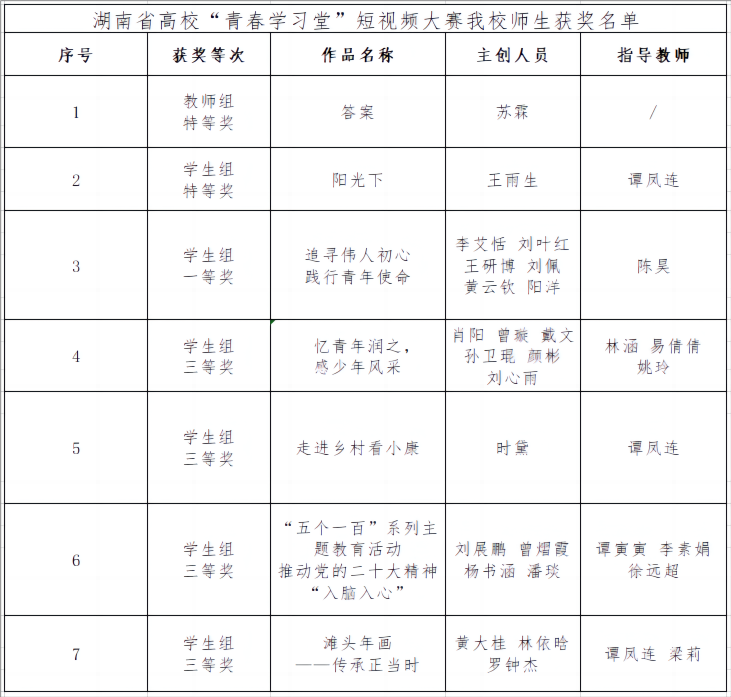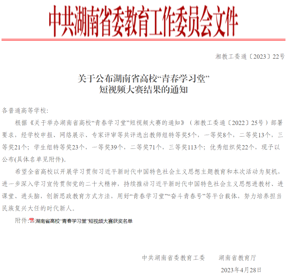 近日,中共湖南省委教育工委、湖南省教育厅公布了湖南省高校“青春学习堂”短视频大赛评选结果,我校师生成绩喜人,共荣获2个特等奖、1个一等奖与4个三等奖7项荣誉,展出视频的点赞量累计超过2400万。