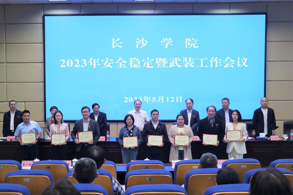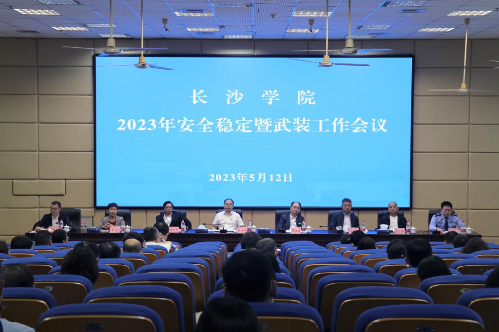5月12日下午,长沙学院2023年安全稳定暨武装工作会议在致远楼学术报告厅召开,党委书记杨小云出席会议并讲话。他强调,2023年是学校“升硕”决胜之年,必须坚决维护好校园安全稳定,要推动构建纵向到底、横向到边的安全稳定工作责任体系,形成事事有人抓、处处有人管的安全稳定工作新局面。会议由党委副书记、校长黄立宏主持,洪山桥派出所所长刘栋、全体在家校领导出席会议。