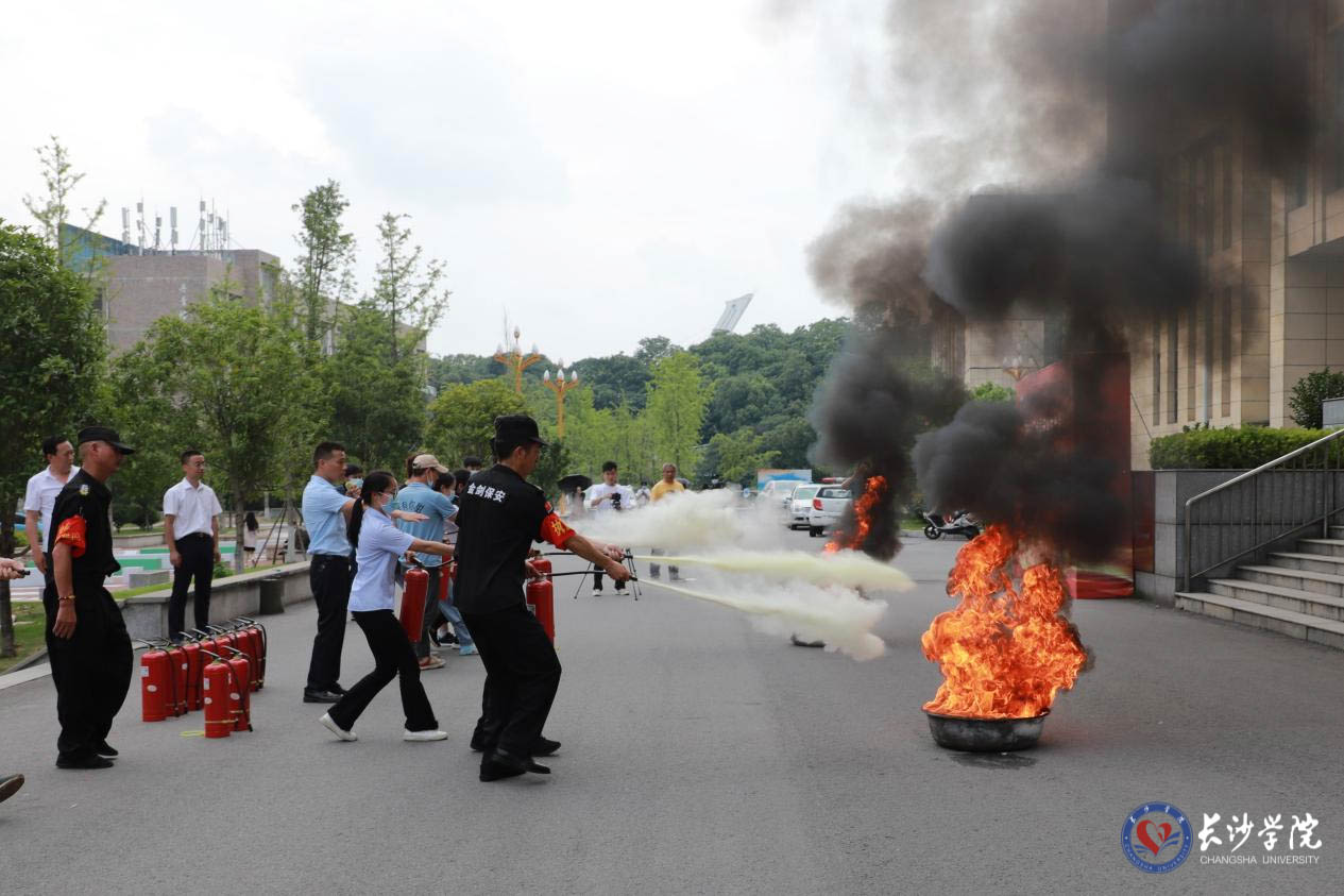 学校保卫处工作人员在教官指导下使用灭火器灭火