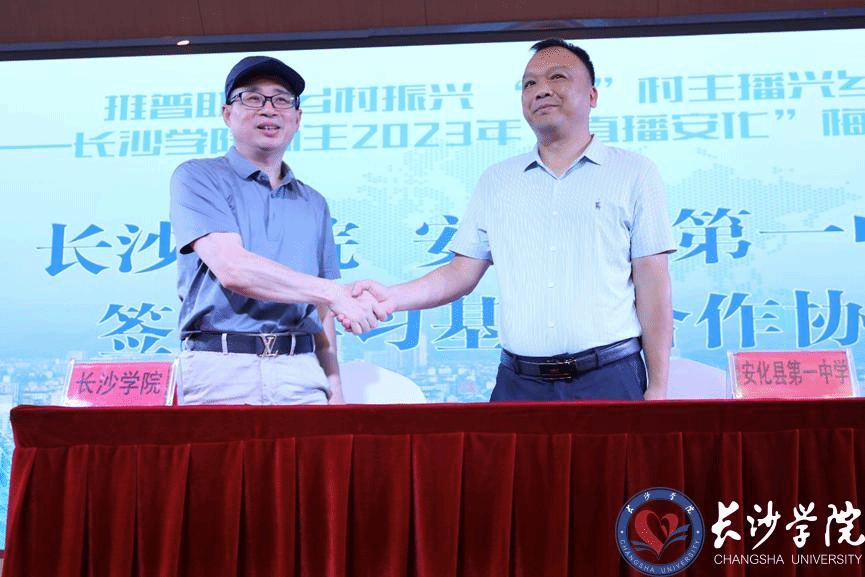 启动仪式上,长沙学院与安化县梅城镇人民政府、安化一中分别签订了校地战略合作协议、共建实习基地协议,进行了“长沙学院直播电商实践教学基地”“长沙学院音视频创作生产实习实践基地”“长沙学院融媒体推广国家通用语言文字基地”的授牌,并由荣斌率主播美丽、导演马犇、总监王雅兰、总监曾杞林等特聘实践导师以及长沙学院“厚朴”暑期实践团大学生主播们以现场直播带货安化梅城土特产的方式上了第一堂培训示范课。直播带货安化梅城土特产培训示范课现场,曾广胜表示,团队将以“乡村调研+推广国家通用语言文字+直播带货+短视频拍摄+职业技能培训”为主要内容,将高校的智力、技术和项目资源辐射到梅城镇及周边农村地区,培育用好“新农具”“新农资”,干好“新农活”的“新农人”,为安化县域经济社会高质量发展提供人才支撑、智力支持和技术保障。