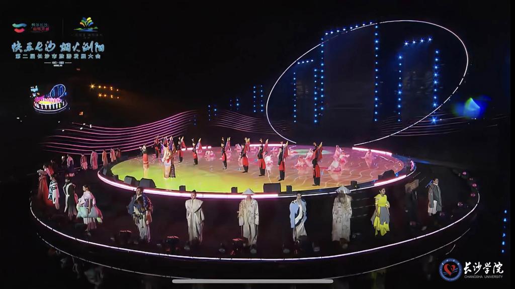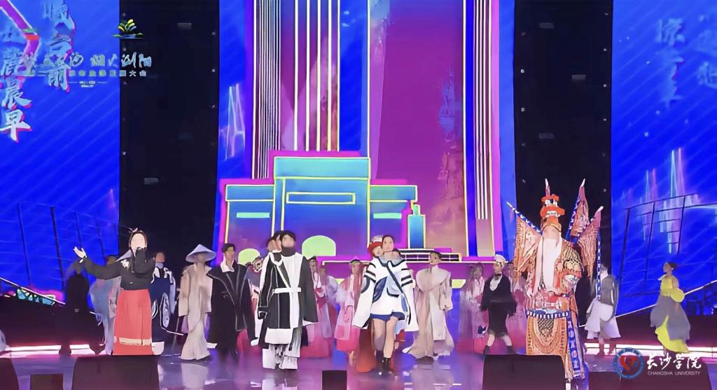 据了解,本次旅发大会邀请艺术设计学院参与“星城潮涌”项目,晚会屏幕上展示的25套国潮服装为我校2022届服装与服饰设计专业学生的设计作品。
