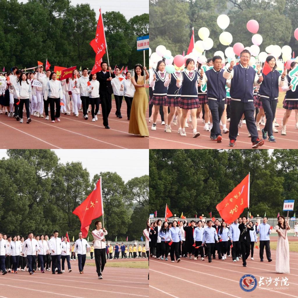 体育场内,双龙盘旋,无人机翱翔,在学校舞龙队和夜鹰无人机协会的精彩开场表演后,裁判员代表和16支师生代表队在国旗护卫队的引领下,步伐矫健,意气风发,踏着整齐划一的步伐进入体育场。计算机科学与工程学院代表队入场时,奔跑的青年高举着五星红旗自方阵上方飞扬而过,燃翻全场;经济与管理学院代表队放飞象征着梦想的彩色气球,仪式感满分;马栏山新媒体学院代表队高举学院特色专业海报,入场独具一格……各代表队无一不展现着长大师生自信昂扬的精神面貌。