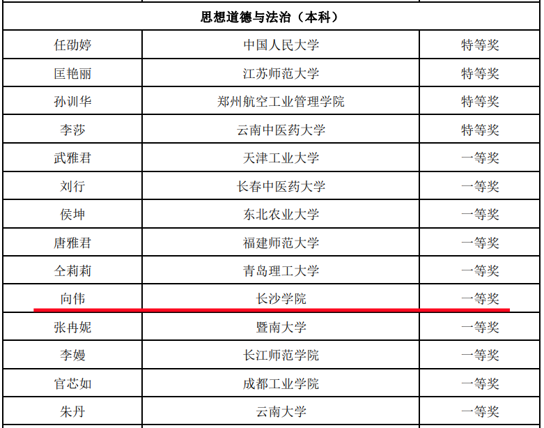 近日,教育部公示了第三届全国高校思想政治理论课教学展示活动“教学竞赛单元”评审结果。湖南省共有13所高校、18名老师入选,我校马克思主义学院向伟博士荣获《思想道德与法治》课程本科组一等奖。